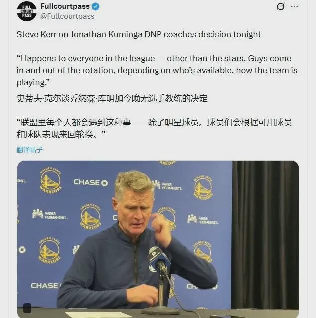 赛后,勇士主帅科尔谈到了为何DNP库明加,表示这就是NBA的运作方式,总会有人努力抢你的工作。